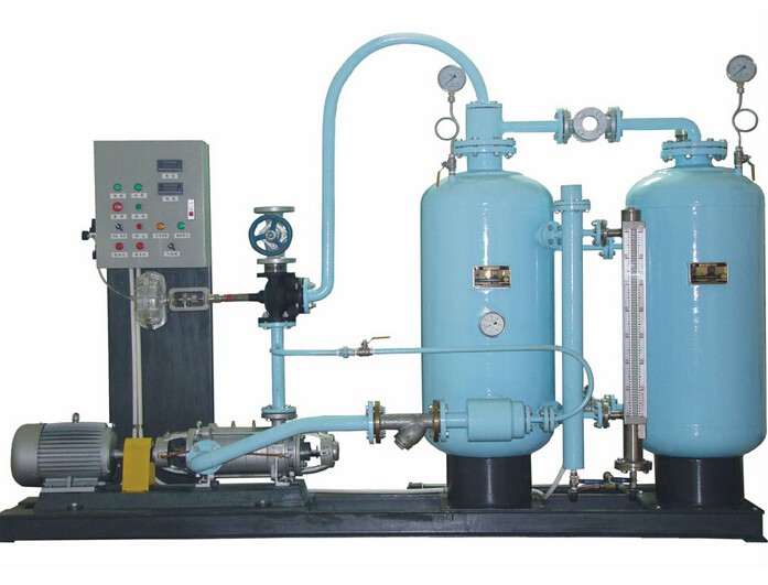 冷凝水回收器由汽水引射混流裝置、過濾除污裝置、余汽再利用裝置、汽水流程轉(zhuǎn)換裝置、內(nèi)置式防汽蝕裝置、集水器、OMRON高感度液位變送傳感器、電控箱、高溫高壓冷凝水回收泵等組成。